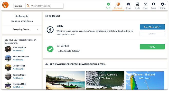 문화경험 교환에 기반을 두고 있는 플랫폼. 관심사를 상세히 작성한 다음 경험과 문화를 교환할 수 있는 호스트에게 메시지를 보내 숙박을 공유한다.