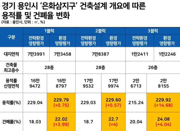 18일 용인시 등에 따르면 ‘은화삼지구’에 들어서는 공동주택 부지 3개 블록의 용적률은 229.77%로 상향 조정됐다. 2017년 진행된 전략환경영향평가 당시에는 평균 224.43%이었지만, 이보다 5.34% 증가했다. 3블록은 용적률이 215.24%라서 다른 블록보다 층수가 낮았으나, 법정한도(230%)를 꽉 채워 최고 용적률을 적용받는다.