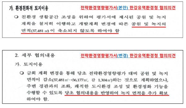 실제로 시행사 측은 환경부로부터도 같은 내용을 지적받았다. 환경부 산하 한강유역환경청은 전략환경영향평가서 변경안에 대해 “당초 협의내용을 반영해 녹지 면적을 추가 확보해야 한다”고 답변했다.