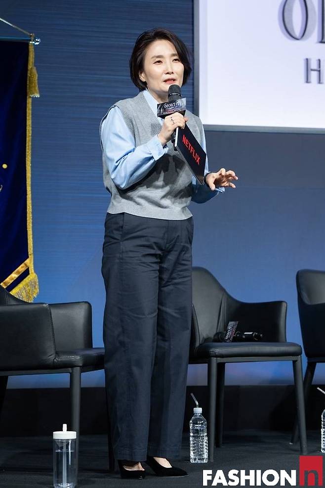 이날 '하이라키' 제작발표회 MC를 맡은 박경림은 라이트 블루 셔츠와 그레이 베스트를 매치한 클래식한 커리어우먼룩 MC룩을 연출했다.
