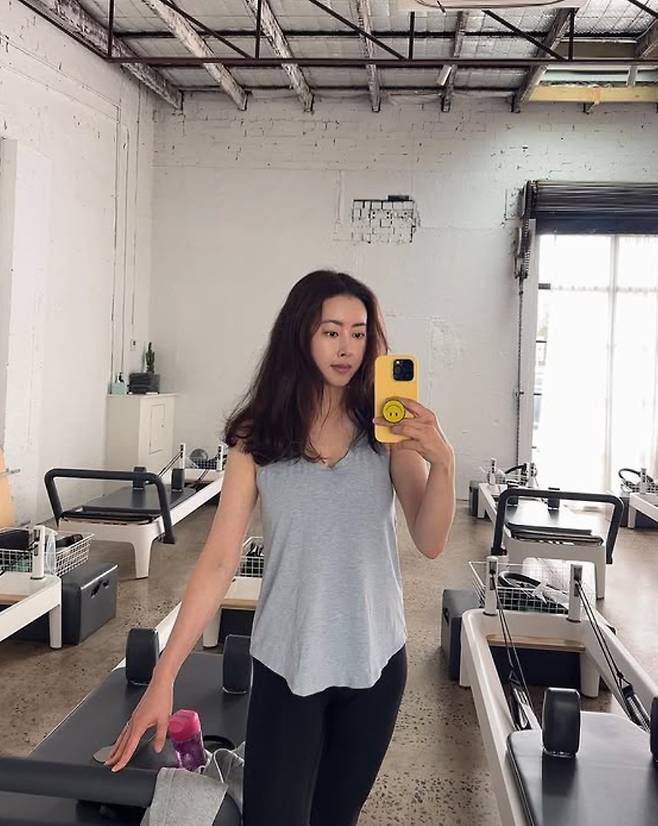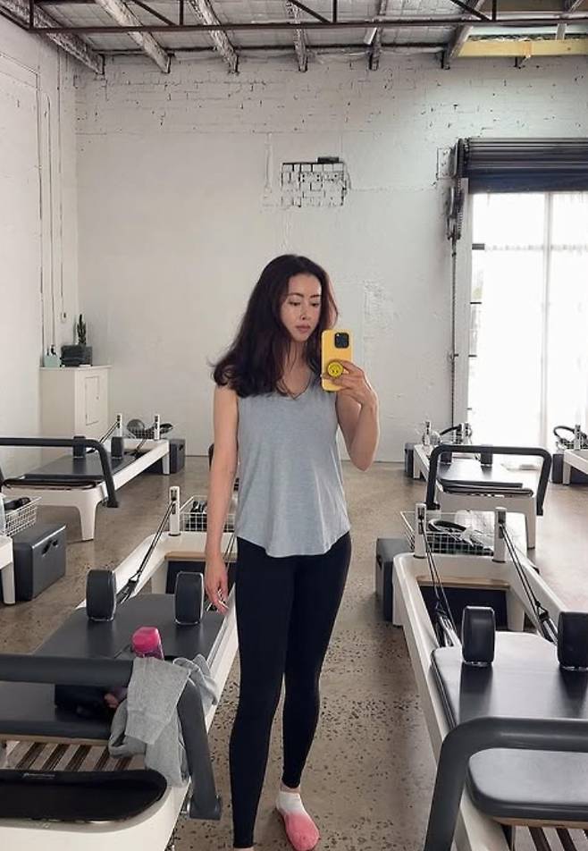 발끝의 핑크 컬러 삭스는 전체적인 무채색 조합 속 작은 포인트가 되어, 단조로울 수 있는 룩에 경쾌함을 불어넣었다. 피트니스 공간에서도 그녀만의 세련된 존재감이 드러나는 순간이었다.