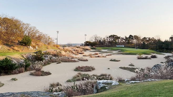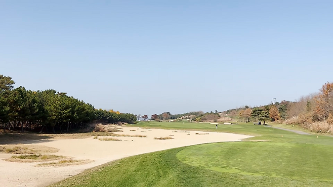 아웃코스 1번 홀이날 플레이한 오션코스는 스카이72cc 4코스(하늘, 오션, 레이크, 클래식) 중 유일하게 잭니클라우스社에서 설계한 코스입니다. 요즘 골프 설계 스타일은 이제는 모든 설계가가 거의 동일하게 자연훼손을 최소화하면서 주변 지형을 최대한 살리는 설계입니다. 거기에 잭니클라우스만의 스타일을 첨가하자면, 자연지형으로 코스가 완성이 되지 않으면 인공암벽이나 벙커 등의 장애물로 조형 설계를 완성한다는 점입니다. 개인적인 생각이지만 오션코스가 자연지형을 넘어 링크스 코스를 만들고자 했었는지 여타 골프장에 비해 많은 100여 개가 넘는 벙커가 페어웨이뿐 아니라 그린 주변에도 적절히 포진되어 있습니다. 특히 몇몇 홀들은 우리가 생각하는 벙커보다는 사진과 같이 코스를 따라 쭉 모래 지형을 만들어놨습니다.