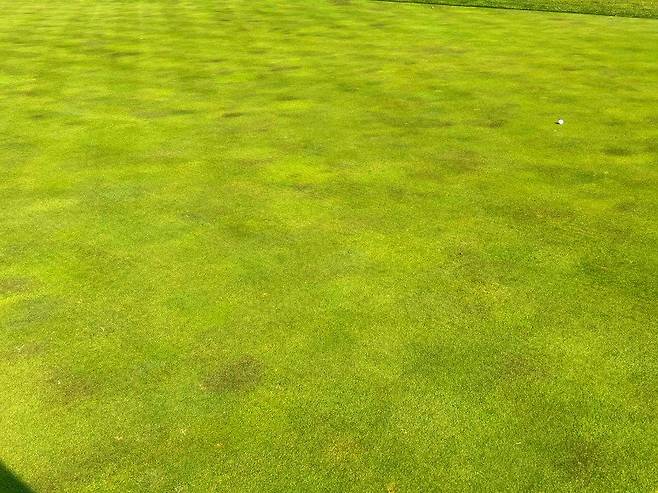 페어웨이가 거의 벤트그라스로 교체가 된 것에 비해 러프는 켄터키블루와 벤트그라스가 섞여있는 형태로 A 러프의 길이가 30-40mm 정도, B 러프는 40-50mm로 생각하시면 될 것 같습니다. 주요 랜딩 지점에는 페어웨이와 마찬가지로 디봇 자국이 있는 편이나 전체적으로 관리 상태가 양호했습니다.