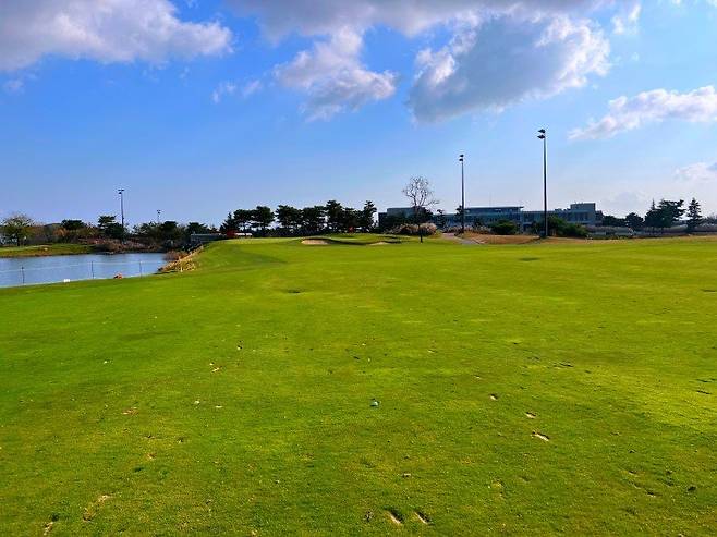 페어웨이는 기존에 켄터키블루 그라스였는데 작년부터 교체 작업을 진행하여 양잔디 중 벤트그라스를 사용하고 있고 잔디 길이는 여느 골프장과 비슷하게 짧게 관리되고 있었습니다. 보통 페어웨이 잔디는 20mm 정도로 관리하는데 스카이72cc 또한 20mm 정도의 길이로 관리되고 있었습니다. 주요 랜딩 지점에는 벤트 그라스이다 보니 디봇 자국이 많이 있는 편임에도 관리는 좋은 편이었습니다. 확실히 조선 잔디 구장에 비해 아직은 초록빛을 유지해서 좋았습니다.