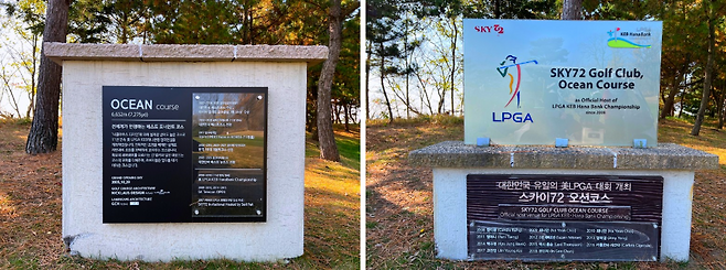 오션 아웃코스 1번 홀에 가면 티샷전 LPGA 대회를 열었던 코스에 대한 안내판이 있습니다. 지금은 BMW 레이디스 대회 등 다른 대회를 한국에서 하지만 2018년도 이전까지는 대한민국 유일의 LPGA 대회 코스였습니다.