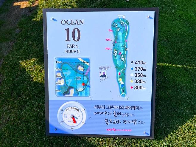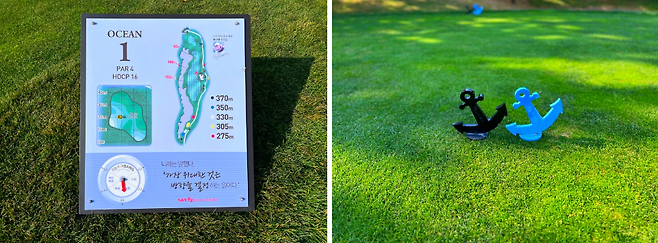 다른 코스도 마찬가지지만 오션코스 또한 별도의 코스 맵이 그려진 안내판이 준비되어 있고, 코스 지도 밑에는 한 번씩 읽으면 좋은 골프 명언이 적혀있습니다. 티잉그라운드의 티블럭은 오션코스를 상징하는 배의 닻 모양의 블럭을 사용하고 있습니다.