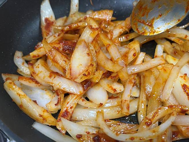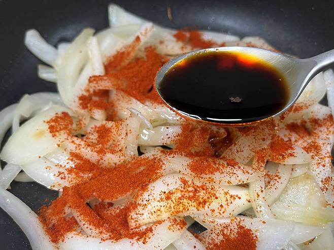 양파가 투명해지면서 익으면 고춧가루를 1/2스푼 넣어 주세요.