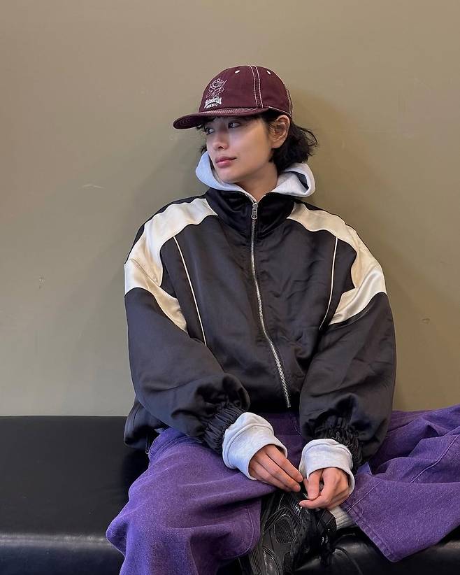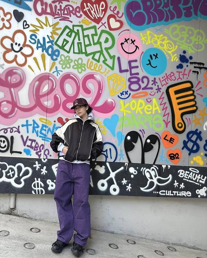 패션의 중심은 단연 퍼플 와이드 팬츠다. 힙한 실루엣과 과감한 컬러감이 만나 도심 속 스트리트 감성을 극대화했다. 상의로 매치한 블랙과 아이보리 배색의 윈드브레이커는 스포티함을 유지하면서도, 후드 이너를 더해 레이어드의 묘미를 살렸다. 전체적인 착장에 흐트러짐이 없지만, 어딘가 자유롭고 거침없는 에너지가 담겨 있다.