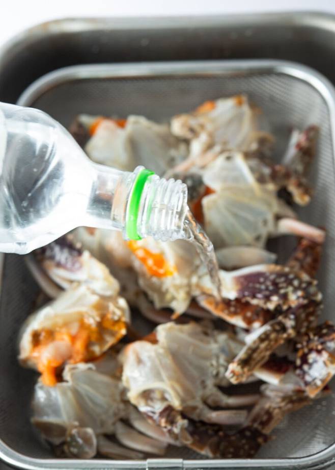 2. 반으로 자른 게에 소주를 뿌려 5분 정도 두거나, 식초물(물 1/2컵 + 식초 2큰술)에 담갔다가 헹궈 표면 살균합니다.