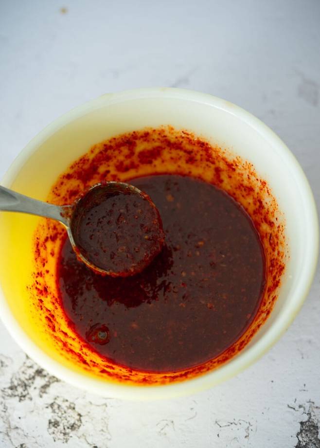 4. 고춧가루, 다진 마늘, 생강, 매실청, 물엿, 설탕을 섞어 양념장을 만듭니다.