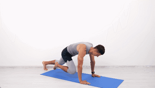 매트에 엎드린 상태에서 플랭크 자세를 취합니다. 오른쪽 무릎을 가슴 쪽으로 당겼다가 원래 위치로 되돌린 후, 왼쪽 무릎을 가슴 쪽으로 당깁니다. 천천히 시작하여 속도를 점차 높이세요.