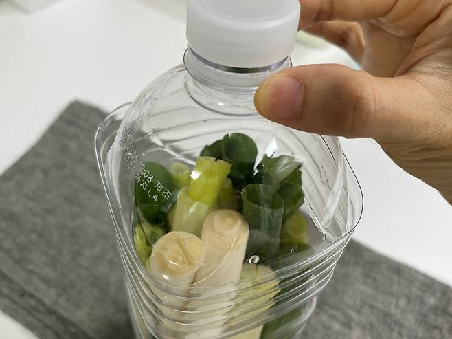 대파를 넣은 뒤 잘라 두었던 페트병의 뚜껑 부분을 끼워 주세요. 이렇게 냉장고에 넣어 보관하면 대파를 싱싱하게 유지할 수 있습니다.