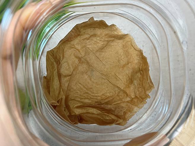야채는 보관하다 보면 자체적으로 물기가 많이 생깁니다. 그렇기 때문에 페트병 바닥에 키친타월을 깔아 수분을 흡수시킵니다.