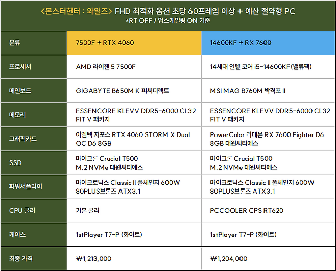 어떠셨습니까? 이번에는 110~120만 원 정도의 예산으로 <몬스터헌터 : 와일즈> FHD 높음 옵션 이상의 플레이가 가능한 본체를 완성할 수 있었습니다. 라이젠 7500F + 라데온 7600 조합으로 그 외 부품에서 최대한 예산을 아끼면 100만 원 스타트도 가능할 것으로 보입니다.