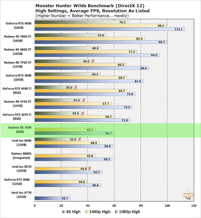 두 제품 모두 <몬스터헌터 : 와일즈>에서의 성능은 거의 비슷하고, 다른 게임에서도 서로 엎치락 뒷치락하는 수준입니다. 편의성 면에서는 확실히 지포스 RTX 4060이 더 우수하고, 가격면에서는 RX 7600이 더 저렴하기에 각각 일장일단이 있습니다.
