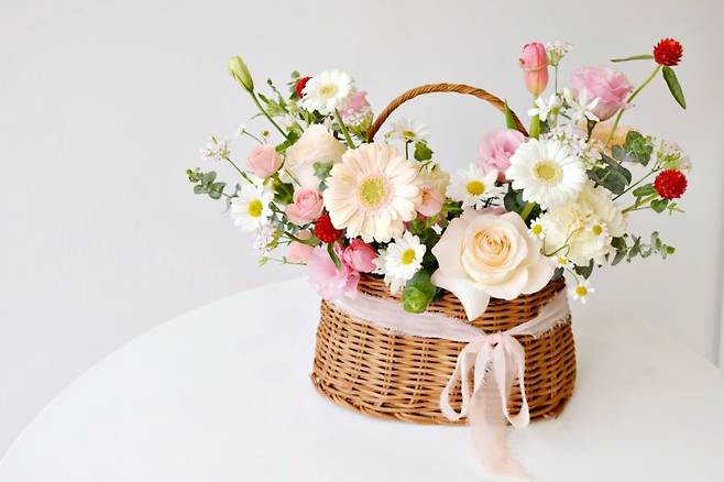 거베라를 비롯한 오번가 장미, 코와니, 라넌큘러스, 화이트 카네이션 등 다양한 꽃을 이용해 나만의 꽃 바구니를 만들 수 있다.