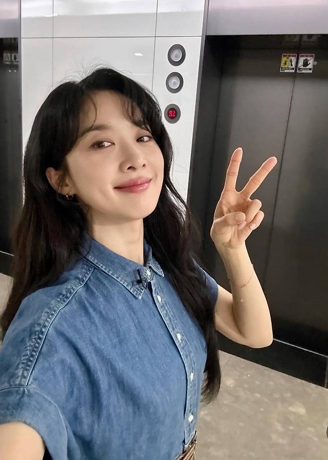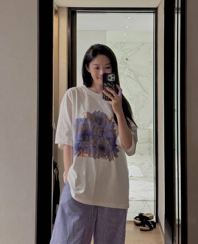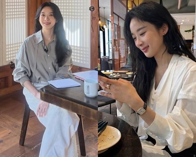 이청아는 오버사이즈 셔츠와 화이트 롱스커트를 매치해 단정하면서도 여유 있는 무드를 연출했습니다.