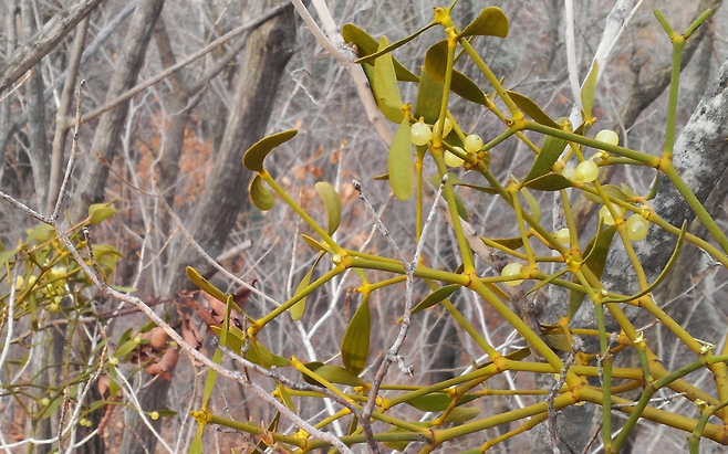 겨우살이는 '줄기-반기생식물'이다. 나무 줄기에 기생하면서 광합성도 일부 수행한다. 다른 식물에서 영양분을 일부 얻지만, 스스로도 에너지를 생산하는 절묘한 생존 전략을 가지고 있다.
