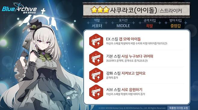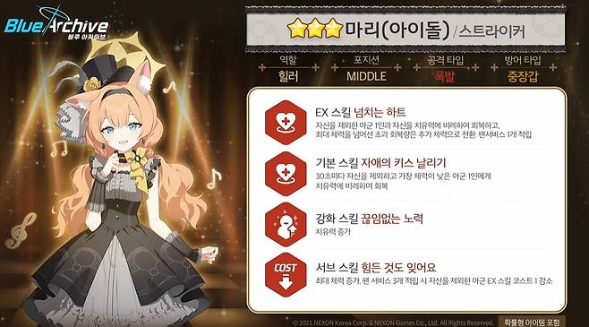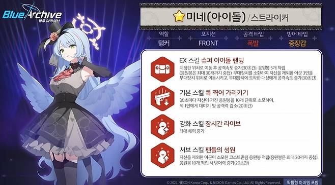 이와 함께 ‘사쿠라코(아이돌)’, ‘미네(아이돌)’, ‘마리(아이돌)’ 등 신규 학생 3종의 전투 포지션과 스킬 구성이 상세히 소개됐다. 세 학생은 모두 폭발 타입 스트라이커로 추가되며, 아이돌 특유의 개성과 각 학생들의 전투 스타일을 동시에 구현한 전용 EX 스킬을 사용한다.