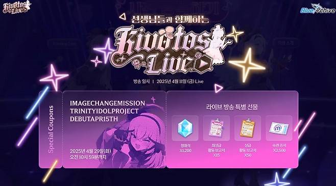 📒- 첫 번째 쿠폰 : 'IMAGECHANGEMISSION' 청휘석 600개 - 두 번째 쿠폰 : 'TRINITYIDOLPROJECT' 상급 활동 보고서 50개, 최상급 활동 보고서 15개 - 세 번째 쿠폰 : 'DEBUTAPR15TH' 청휘석 600개, 숙련 증서 2,500개