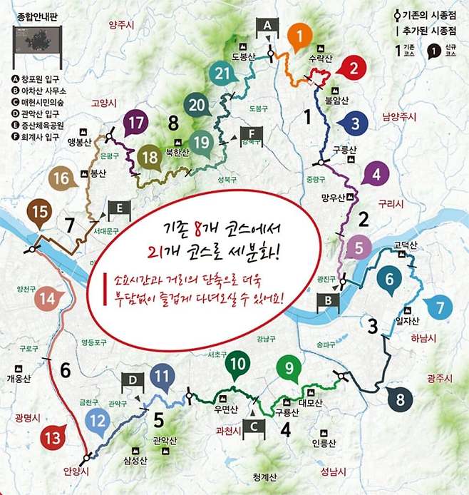 또한, 각 기점 21곳에 시·종점 안내판, 스탬프 함, 코스 안내판을 설치하고 서울둘레길 안내판도 바꾸었다.