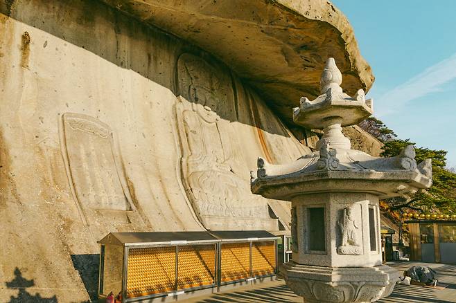 이제 사찰의 하이라이트 '마애석불좌상'을 만나러 갈 시간이다. 사찰과 가까워지면 멀리서부터 이곳이 눈에 띈다. 얼핏 보면 상당히 높고, 먼 곳에 있는 것처럼 보이지만 막상 걸어 올라가면 금세 목적지에 닿는다. 보통의 성인이라면 첫 계단부터 마지막 계단까지 쭉 올라가면 10분 내외로 도착할 수 있다. 중간에 쉬면서 바다 풍경을 감상하고, 인증숏을 남기더라도 왕복 30~40분이면 충분하다.