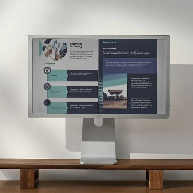 이북 리더로 유명한 북스에서 사무용 모니터를 발표했다. 컬러 전자종이 디스플레이로 만든 미라 프로는 25.3인치, 3200×1800 픽셀 해상도의 디스플레이를 탑재했고 총 4,096개의 색을 표현할 수 있다. 일반 모니터에 비해 눈이 훨씬 편하지만 화면 전환이 느리고 잔상이 남는다. 북스는 화질과 주사율 사이 균형을 잡을 수 있는 네 가지 화면 모드를 제공해 동영상을 시청할 수 있을 정도의 성능을 지니고 있다고. 게임까지는 무리지만 사무용으로는 충분히 사용 가능할 수준. 프론트 라이트가 있어 어두운 곳에서도 잘 보인다. 가격은 1,899.99달러(약 265만 원).