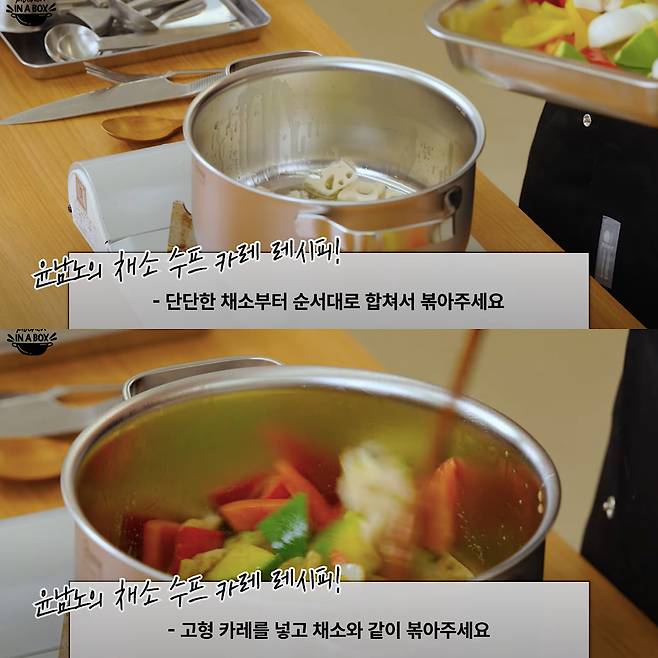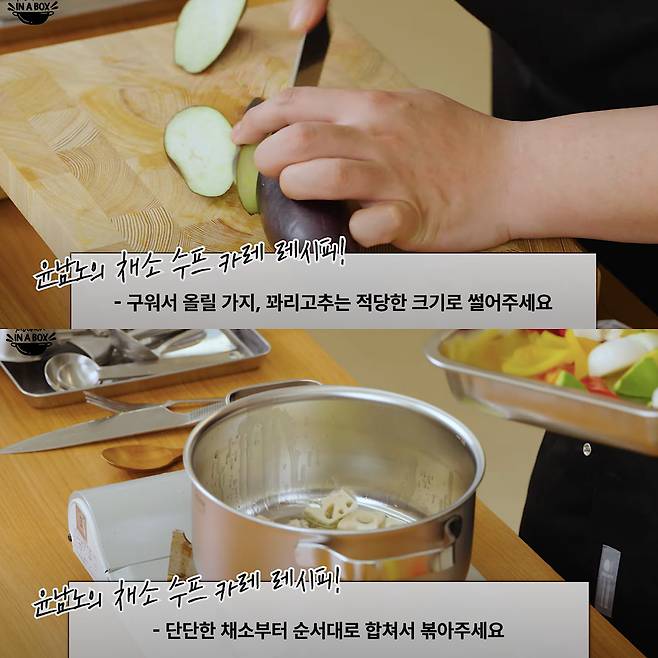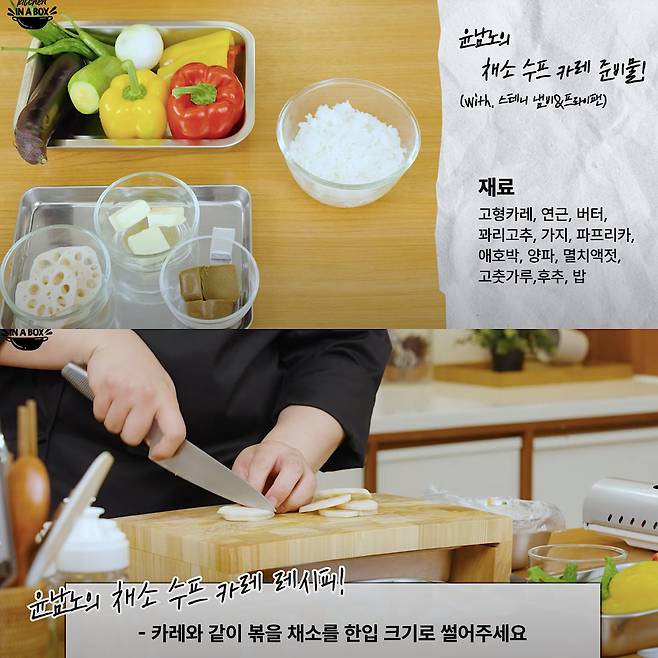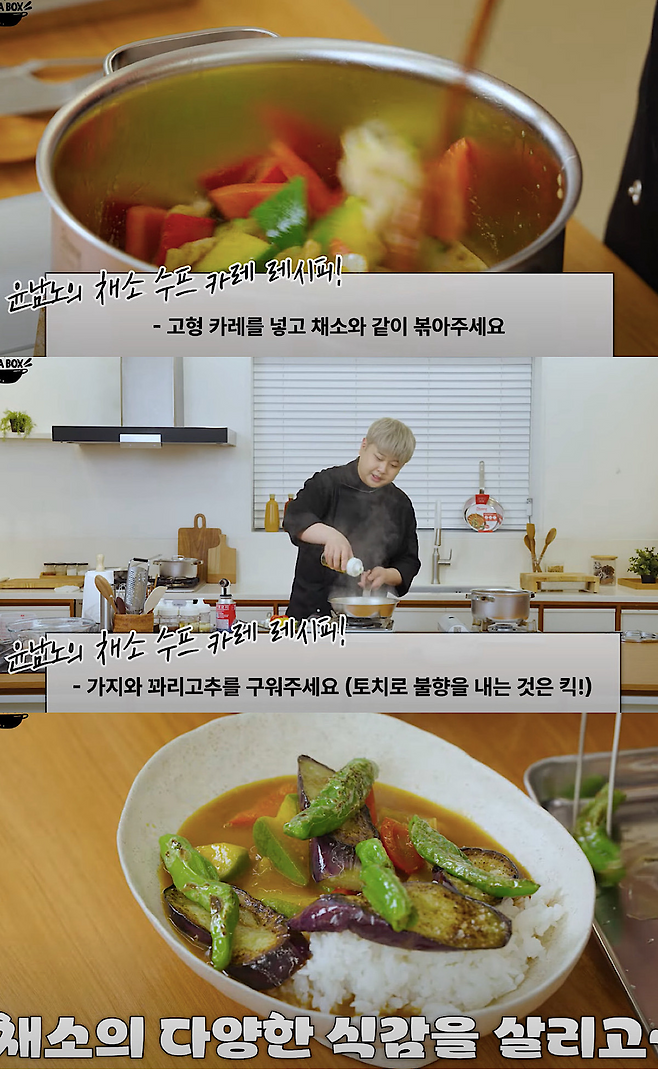윤남노는 유튜브 채널을 통해 “밥 위에 채소만 잘 올려도 다이어트가 된다”라며 조리 과정을 소개했습니다. 애호박, 양파, 파프리카, 연근을 먼저 손질해 버터에 살짝 볶고, 고형 카레와 고춧가루·간장·멸치액젓·후춧가루로 맛을 냅니다. 여기에 오일을 두른 팬에서 가지와 꽈리고추를 노릇하게 구워 곁들이면 밥 위에 완성되는 한 그릇. 겉은 바삭하면서 속은 촉촉한 채소와 스프카레가 어우러져, 보기에도 근사한 다이어트 식단이 됩니다.