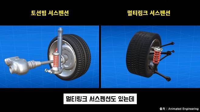 결론을 내보자면 후륜의 서스펜션이 토션빔 서스펜션도 있고 멀티링크 서스펜션도 있는데, 토션빔 서스펜션 그 자체로만 있으면 그나마 괜찮은데 거기다가 한국 사양에 AM 링크를 접목시켜 놨기 때문에 오히려 그 조화가 안 맞아서 승차감이 안 좋아졌다고 봐야 하는 거죠. 이게 큰 충격을 받을 때 승차감이 안 좋아지는데, 우리나라 도로 사정이 좋지는 않잖아요. 방지턱도 높고 포트홀도 많고요. 그런 충격은 AM 링크가 못 받아줍니다. 그래서 오히려 더 데미지가 커지는 거죠.