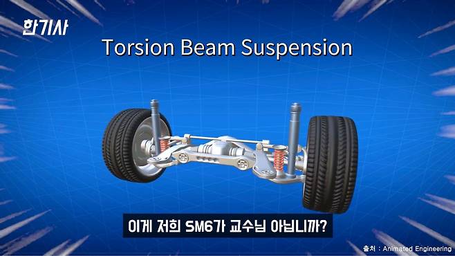 르노삼성 SM6의 단점 하면 일단 또 승차감 얘기 안 할 수 없죠. 그중에서 이제 토션빔이라고 다들 아시죠? 저희 SM6가 또 교수님 아닙니까? 전 국민에게 토션빔을 알려준 차량이에요. 토션빔 얘기를 안 할 수가 없을 것 같습니다.