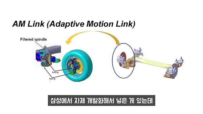 이 차량 승차감은 왜 안 좋은지 알아봤는데, SM6는 일반 토션빔이 아닙니다. 뭐 하나를 꼈어요. 그게 뭐냐면 토션빔의 끝부분에 'AM 링크'라고 삼성에서 자체 개발화해서 넣은 부품이 있는데, 이게 해외 사양에는 안 들어가요. 해외 사양은 그냥 일반 토션빔이고 국산은 AM 링크가 들어가는데, 취지는 좋아요. 잔진동이나 같은 걸 감쇄시켜 주는 능력이 있긴 하지만, 그걸 넘어선 큰 충격이 들어왔을 때 오히려 승차감을 더 더럽게 만듭니다. 왜냐면 뒷차축은 위/아래로만 움직여야 되는데, 이 AM 링크 때문에 큰 충격을 봤을 때 위/아래로 움직이는 것뿐만 아니라 앞/뒤로도 움직여요. 축이 4방향으로 다 움직여요.