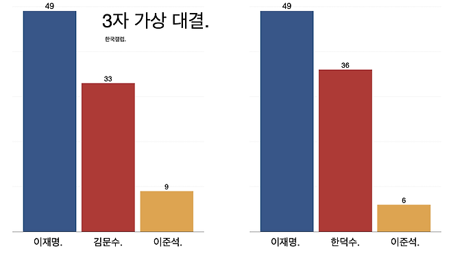 - 이재명과 한덕수, 이준석 구도는 47%와 34%, 6%였다.