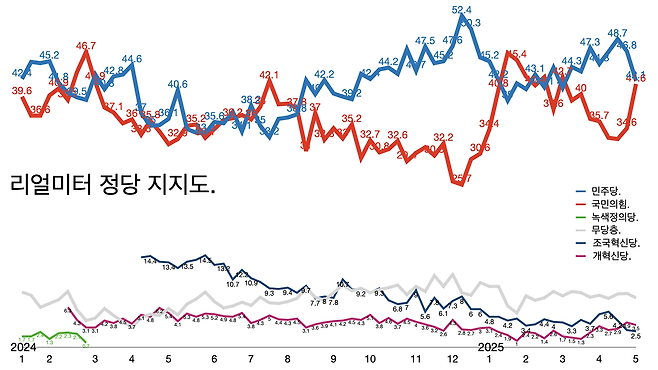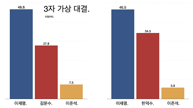 - 리얼미터 조사에서 이재명과 김문수, 이준석 구도는 47%와 28%, 8%였다.