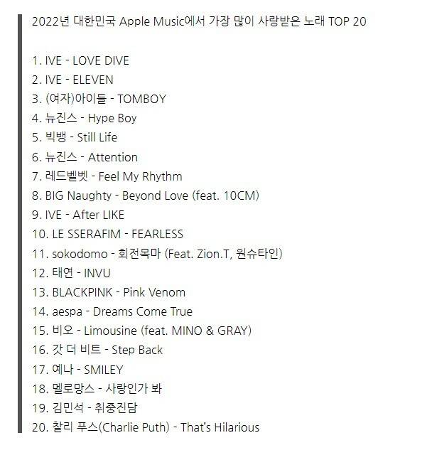 Replay는 Apple Music을 이용할 수 있는 모든 169개 국가 및 지역에서 39개 언어로 현지화 된다고 하는데요, 또 애플은 오늘 2022년 한해 동안 가장 많이 사랑을 받은 노래를 포함한 2022년 연말 총결산 차트도 공개되었습니다. 국내에서는 아래와 같은 곡들이 Top 20에 들기도 했네요.