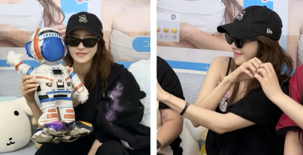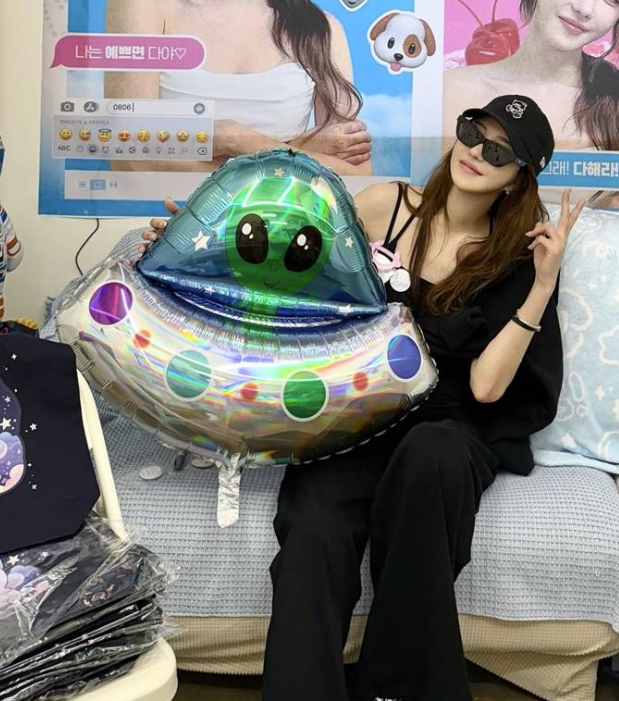 사진 속 그녀는 어깨가 드러나는 블랙 민소매 톱과 팬츠, 그리고 블랙 볼캡으로 캐주얼하면서도 스타일리시한 생일룩을 완성했습니다. 우주 인형과 풍선을 들고 있는 모습은 동심으로 돌아간 듯한 귀여운 매력을 더했어요. 🎈🎉