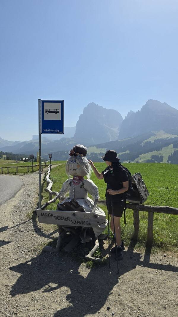 알페 디 시우시를 효과적으로 트레킹 하기 위한 방법으로 추천되는 방법 중 하나인 버스와 전통적인 트레일이 교차하는 지점입니다.