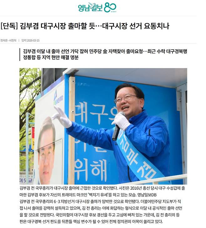 - 오늘(16일)자 영남일보 1면에 김부겸 전 총리 얼굴이 실렸다. "김부겸 등판 초읽기"라는. 인터넷판 제목은 조금 달랐다. "김부겸 대구시장 출마할 듯…대구시장 선거 요동치나"