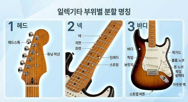 운전을 배우기 위해선 무엇이 핸들인지, 무엇이 브레이크인지 각 조작부의 명칭부터 익히는 게 인지상정이다. 기타도 마찬가지다. 사람 키보다 작은 기타 한 대에도 많은 부품과 명칭들이 숨어있다. 초보자들은 이런 기초적인 명칭부터 습득하는 것이 내공을 쌓는데 가장 효율적인 시작이다. 기타는 크게 헤드, 넥, 바디 부분으로 나뉜다.