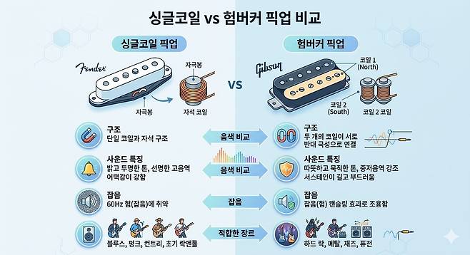 픽업에는 크게 두 종류가 있고, 이것이 기타 음색의 성격을 결정짓는 가장 중요한 요소다. 싱글코일(Single Coil)은 가느다란 코일이 하나인 픽업이다. 선명하고 밝은 음색이 특징으로, 컨트리, 블루스, 펑크(Funk), 클린 팝 사운드에 잘 어울린다. 펜더 스트라토캐스터와 텔레캐스터에 주로 탑재된다. 단점은 전기 잡음(험)에 취약하다는 것이다.