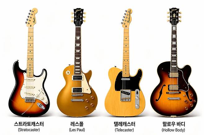 기타의 각 부분별 명칭과 기능을 숙지했다면, 영상이나 사진 속에 나오는 일렉기타의 구조가 눈에 들어올 것이다. 더불어 기타의 바디와 헤드의 모양이 크게 네가지로 나뉜다는 것도 알게 될 것이다. 기타의 모양은 제조사마다 다르기 때문에 시그니처라고 부를수 있다.