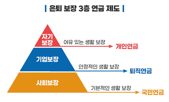 그래서 오늘은 연금을 쉽게 이해하기 위해 시작 전에 은퇴 보장 3층 연금 제도와 개인연금에 대한 체계를 먼저 보여드리는 것이 좋을 것 같습니다.