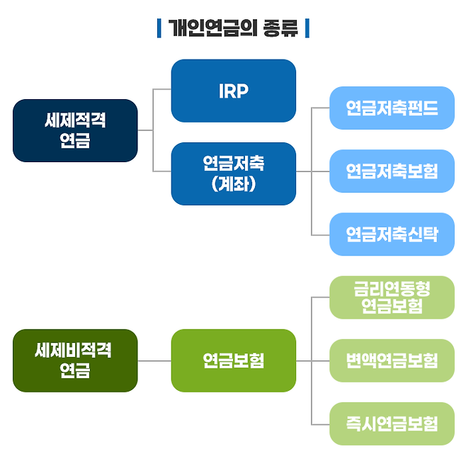 이렇게 중요한 개인연금은 크게 세제적격과 세제비적격 연금으로 나눌 수 있는데요. 연금별로 구체적인 상품들은 아래의 그림을 확인해 보시기 바랍니다.
