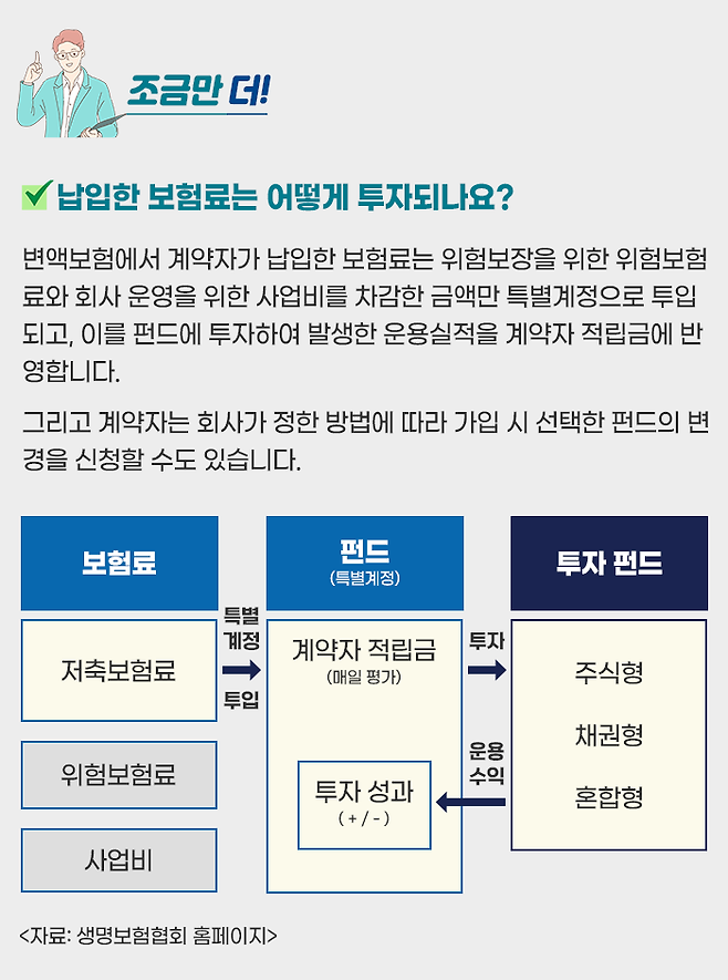 변액보험의 근본은 보험이지만 선취보수를 내는 펀드처럼 비용을 제외한 적립금을 투자하기 때문에, 투자 성과에 따라 환급금과 보험금이 달라지는 투자상품이기도 합니다.