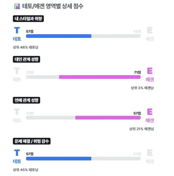 타입스 테스트는 결과와 함께 영역별 상세 점수도 제공합니다. 이는 스타일과 취향, 대인관계, 연애, 문제해결 및 위험감수 등 다양한 카테고리로 나누어 분석한 것으로, 자신의 성향이 영역별로 어떻게 다르게 나타나는지 확인할 수 있습니다.