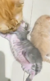그 신호를 놓칠 리 없는 어미 고양이는 곧바로 다가와 새끼의 얼굴과 머리를 부드럽게 핥으며 애정을 표현했다. 화면에는 어미 고양이가 코로 살짝 부비고, 꼼지락거리는 새끼를 세심하게 단장해 주는 모습이 이어졌다.