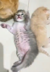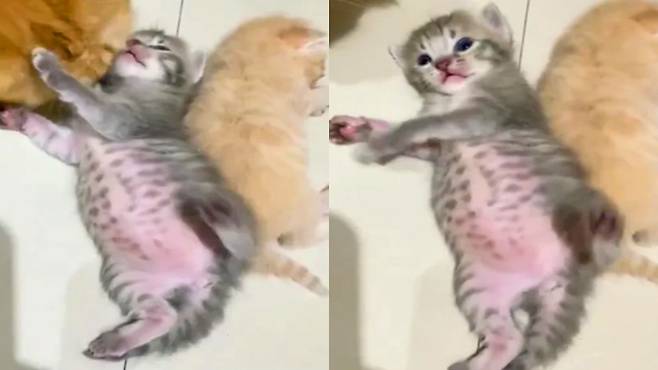 막 젖을 먹고 배가 잔뜩 부른 새끼 고양이가 보여준 행동이 온라인에서 큰 화제가 되고 있다 SNS 플랫폼 X에 올라온 영상에는 늘어진 몸으로 꼼짝 못 하면서도, 엄마에게 다가오라는 듯 한쪽 앞발과 뒷발을 번갈아 흔드는 작은 회색 새끼 고양이가 등장한다.