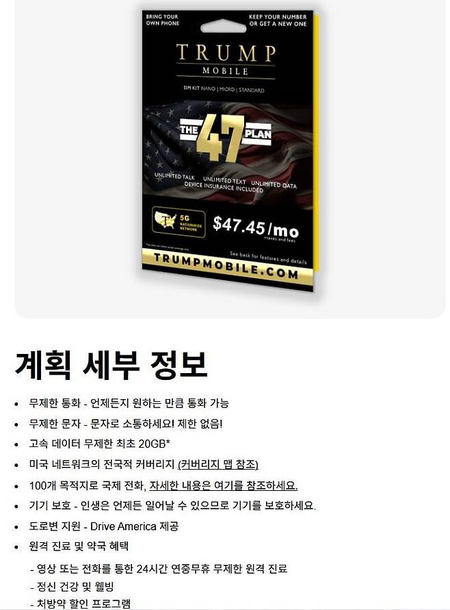 트럼프 모바일은 THE 47 PLAN 이라는 월 47.45$ 무제한 요금제를 제공하며