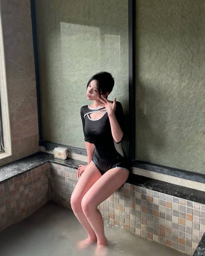 마지막은 따뜻한 실내탕에서 선보인 블랙 모노키니입니다. 앞선 두 착장이 청순하고 우아한 매력이었다면, 이 착장은 스포티하면서도 시크한 반전 매력을 보여줍니다.