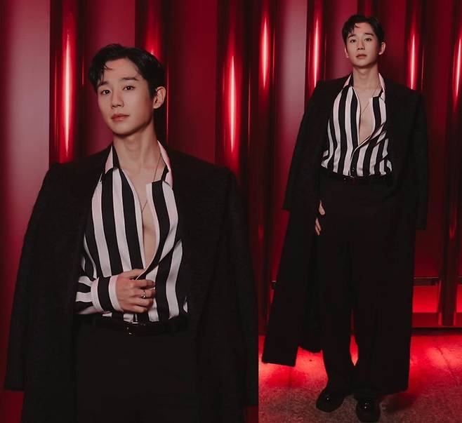 특히 정해인은 패션쇼가 끝나고 스트라이프 셔츠를 풀어헤친 섹시한 슈트로 애프터 파티룩을 연출해 주목을 끌었다.