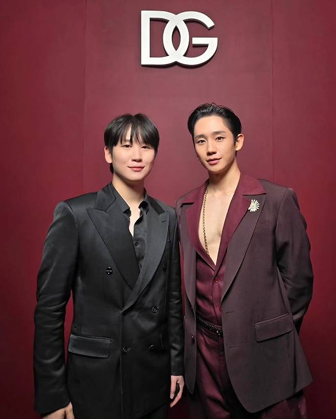 이번 돌체앤가바나 2025 F/W 남성복 패션쇼에 노상현, 남윤수와 함께 한국 대표로 참석한 정해인은 버건디 셋업 슈트에 골드 브로치로 포인트를 준 룩을 완벽히 소화한 모습으로 등장해 스포트라이트를 한 몸에 받았다.